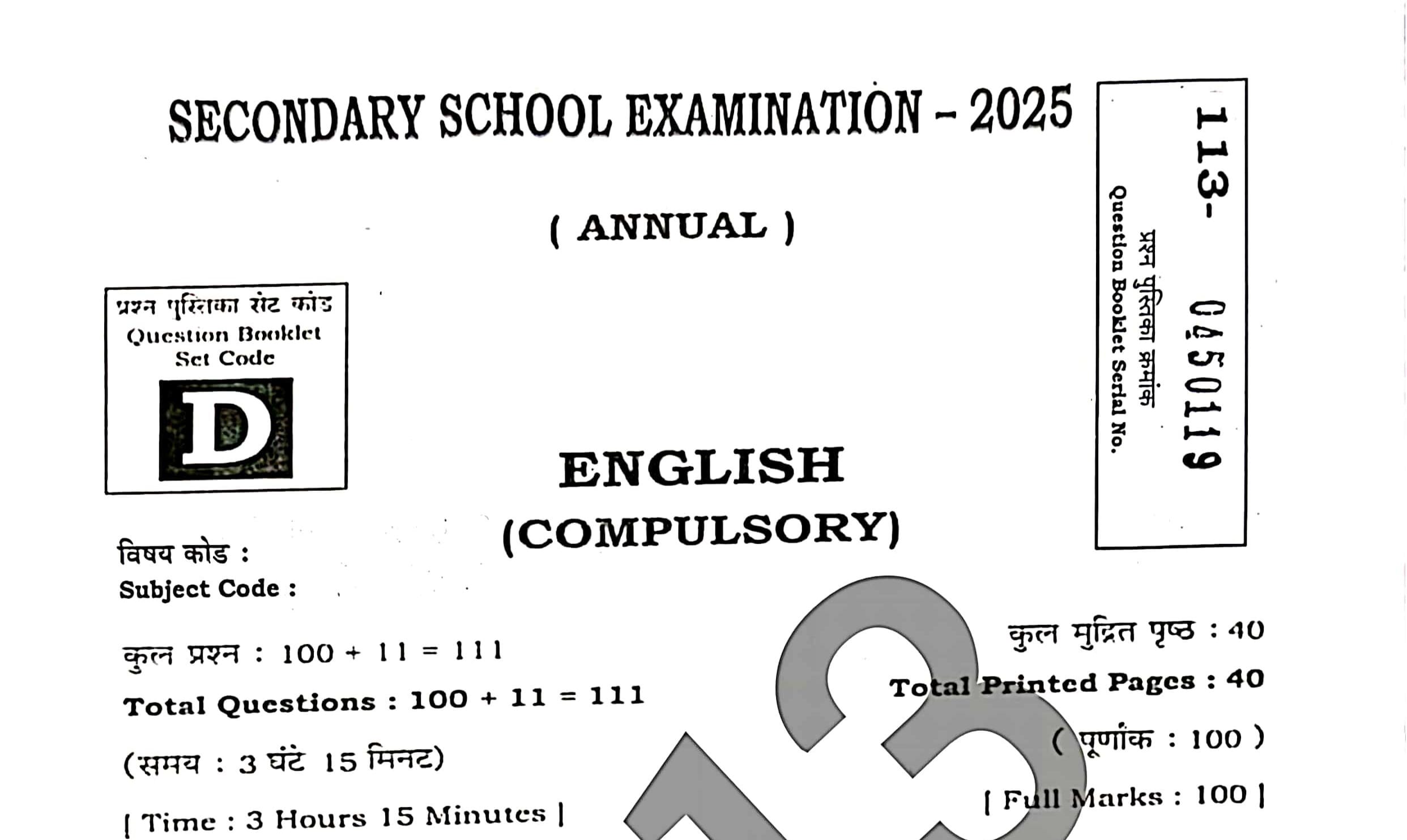 | विषय का कोड | प्रथम पाली 113 और द्वितीय पाली 213 |